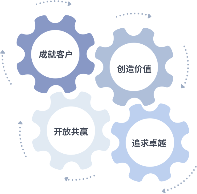 成就客户是一切决策的出发点,创造价值是衡量所有工作的标准,追求卓越是JDB电子夺宝做事做人的态度,开放共赢是JDB电子夺宝的格局也是最终的结果。价值观的齿轮环环相扣,推动着组织里的每个人不断向前。